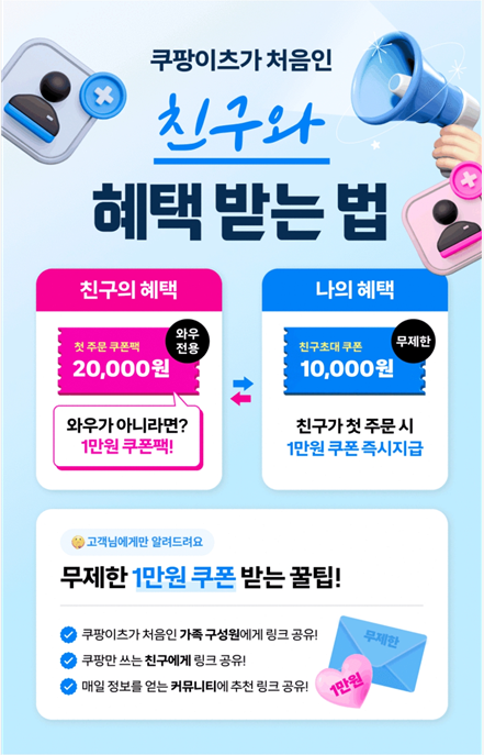 - 쿠팡와우 회원 가입까지 하면 2만 원 사용가능하고, 아니면 1만 원 사용이 가능함.